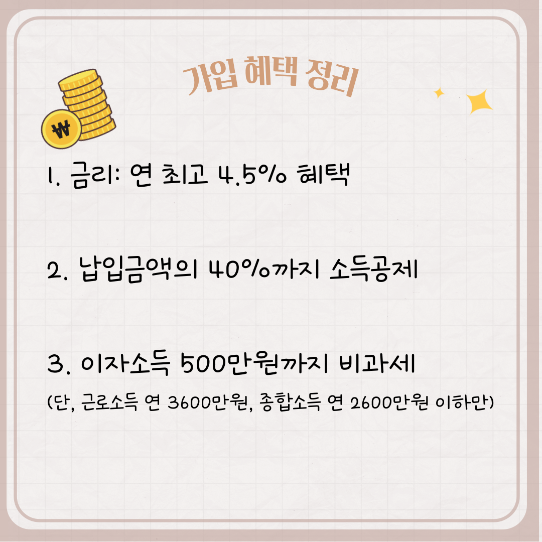 - 연 납입금액(최대 300만원)의 40% 소득공제